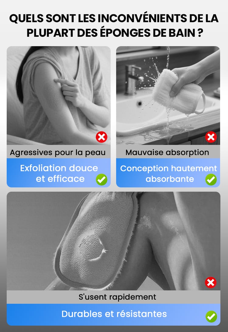 R : L'éponge peut être utilisée quotidiennement en toute sécurité. Pour obtenir les meilleurs résultats, utilisez-la 2 à 3 fois par semaine afin d'éliminer les cellules mortes et d'obtenir une peau plus lisse et plus éclatante.