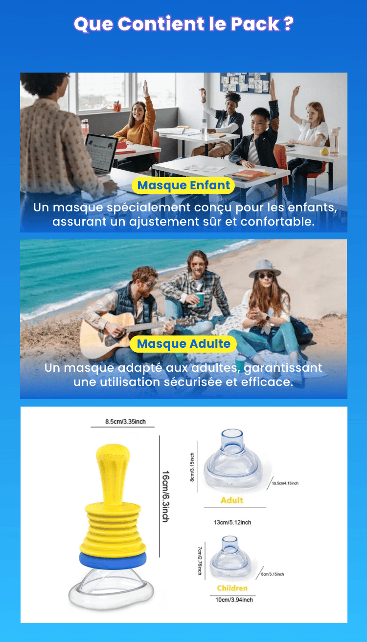 Il est adapté à tous ceux qui souhaitent améliorer leur capacité pulmonaire et leur aptitude respiratoire, ainsi qu'aux familles qui doivent faire face à des risques d'étouffement chez les enfants.
