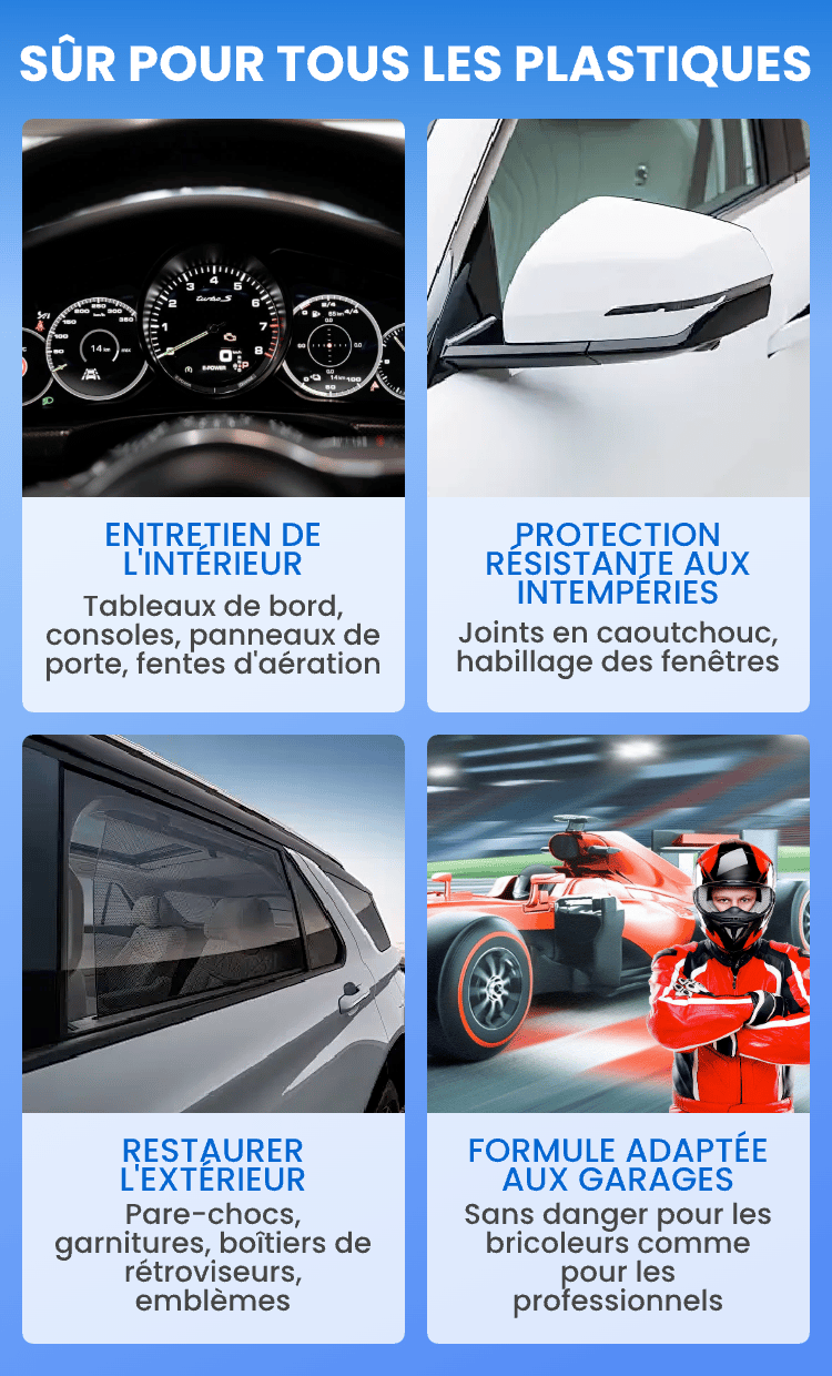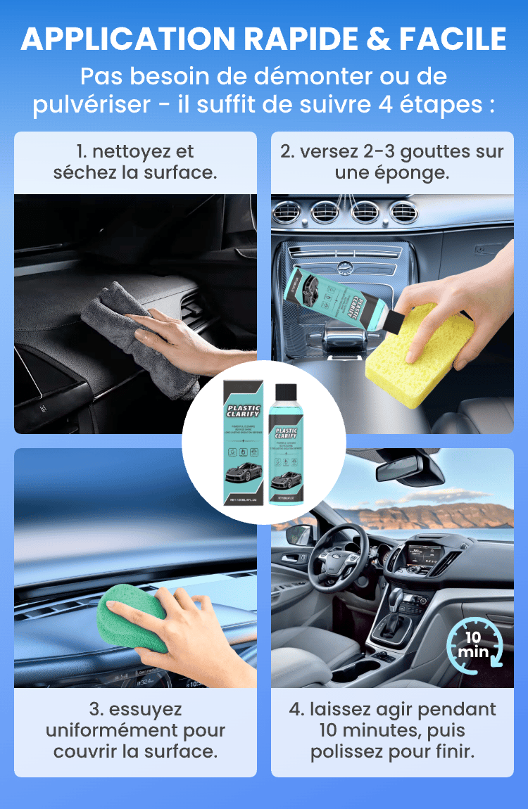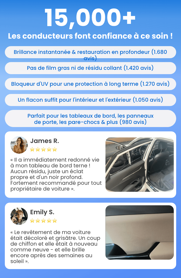 « J'ai utilisé ce produit sur ma console centrale et mes panneaux de porte - la différence était énorme. Pas de résidu gras, juste une couleur propre et riche qui dure vraiment. »