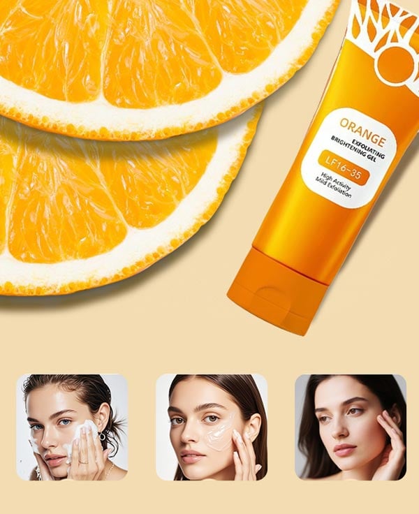 Les fibres végétales naturelles et les enzymes d'orange exfolient en douceur les cellules mortes de la peau, révélant une peau plus lisse, plus lumineuse et plus radieuse avec une utilisation régulière.