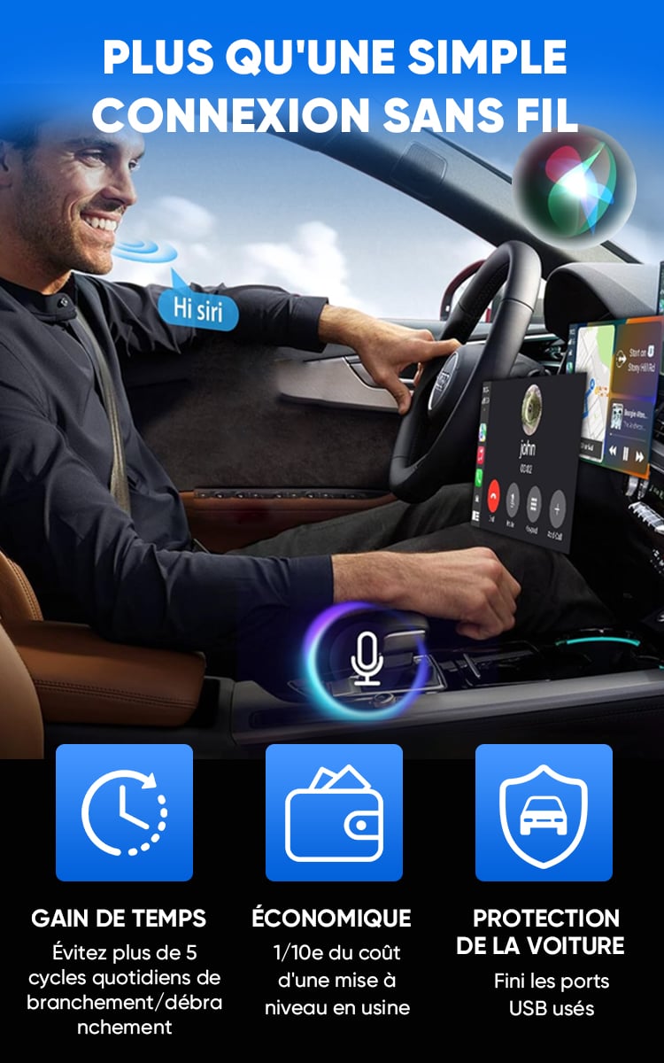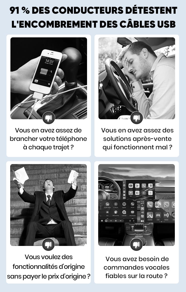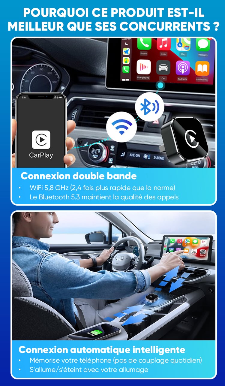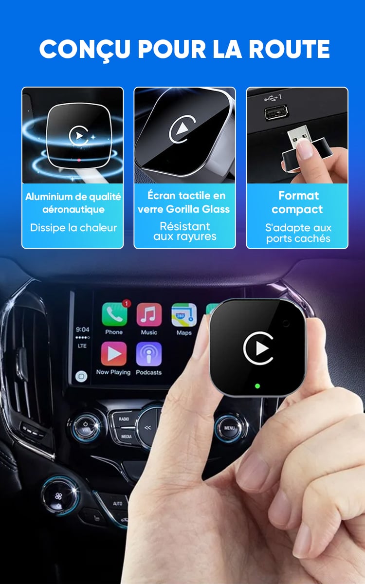 R : Oui ! Notre adaptateur est compatible aussi bien avec les iPhone utilisant CarPlay qu’avec les téléphones Android utilisant Android Auto. Il fonctionne avec la plupart des véhicules équipés de CarPlay filaire.