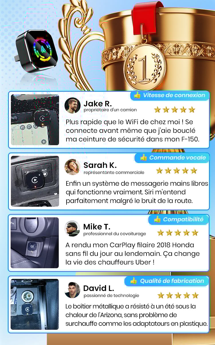 Cette adaptateur a changé ma façon de conduire — je ne branche plus mon téléphone à chaque fois. Il se connecte automatiquement et fonctionne parfaitement.