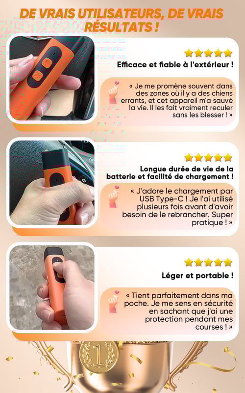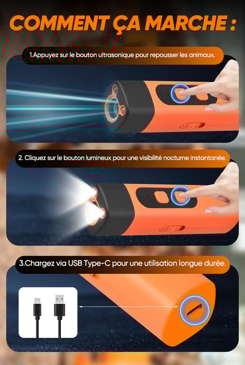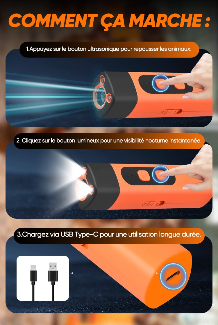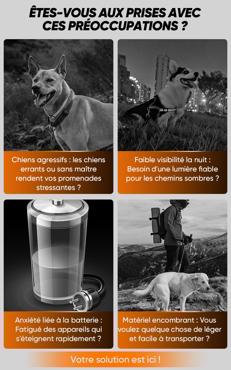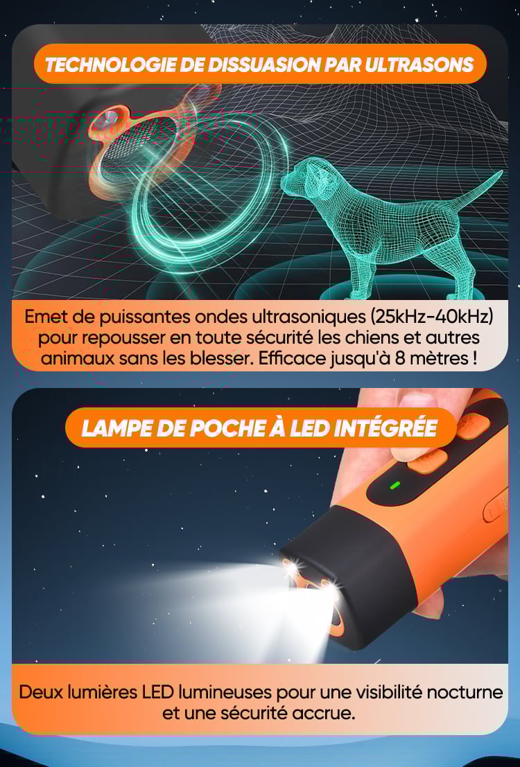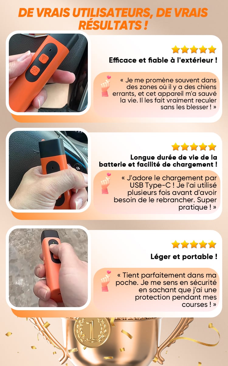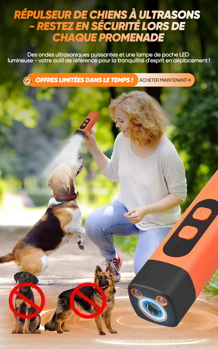 Oui ! L'appareil utilise des ondes ultrasoniques à haute fréquence de 25 kHz à 40 kHz, ce qui est efficace pour mettre la plupart des chiens mal à l'aise et les faire partir sans les blesser. De nombreux utilisateurs ont déclaré qu'il était très efficace lorsqu'ils rencontraient des chiens errants à l'extérieur.