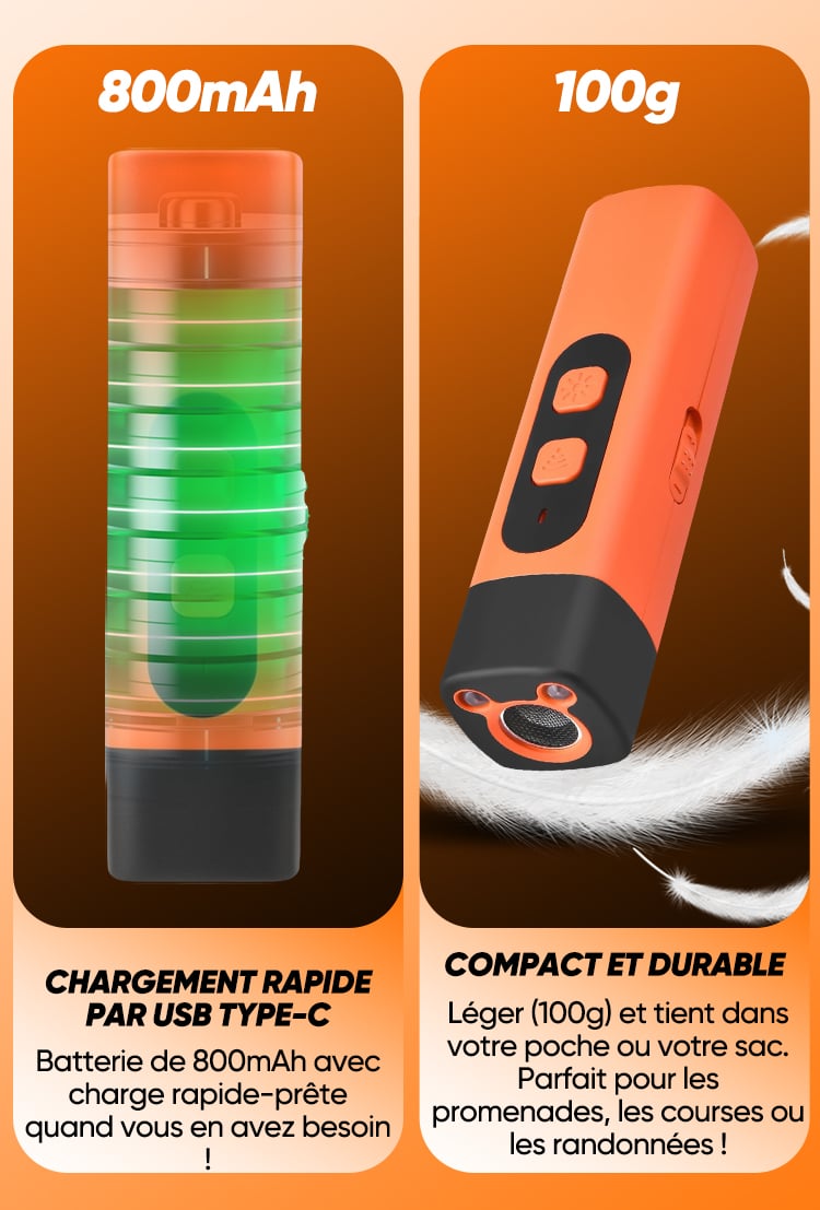 La portée est bonne, et je l'ai même utilisé pour lutter contre le bruit du chien d'un voisin. Il est compact, facile à transporter et se charge rapidement. Dans l'ensemble, c'est un outil utile pour le dressage et la gestion des aboiements sans stress.