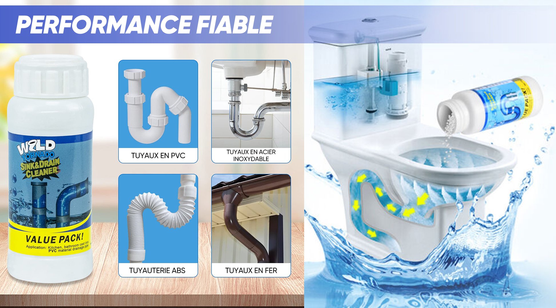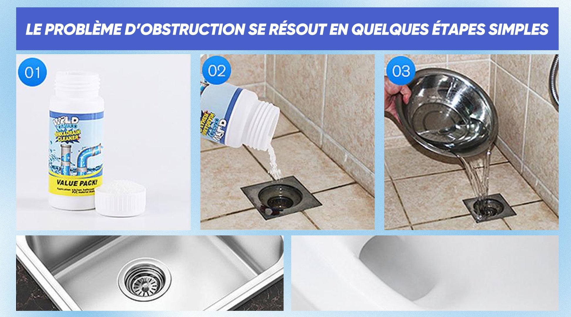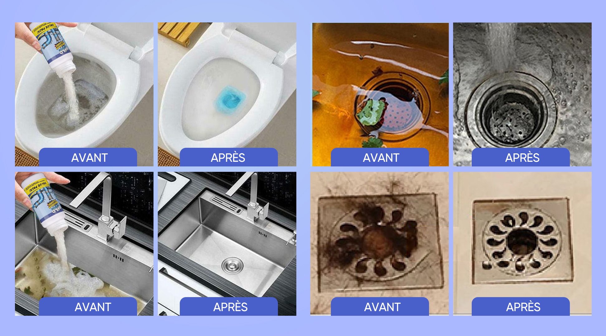 Dissout facilement la graisse, les cheveux, les huiles, la mousse de savon et les produits en papier.