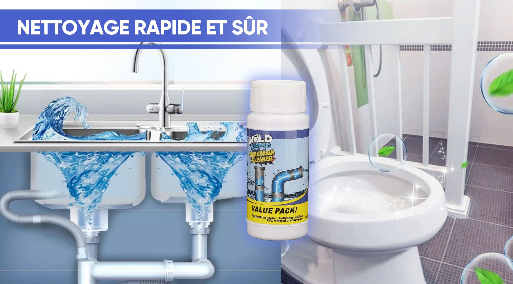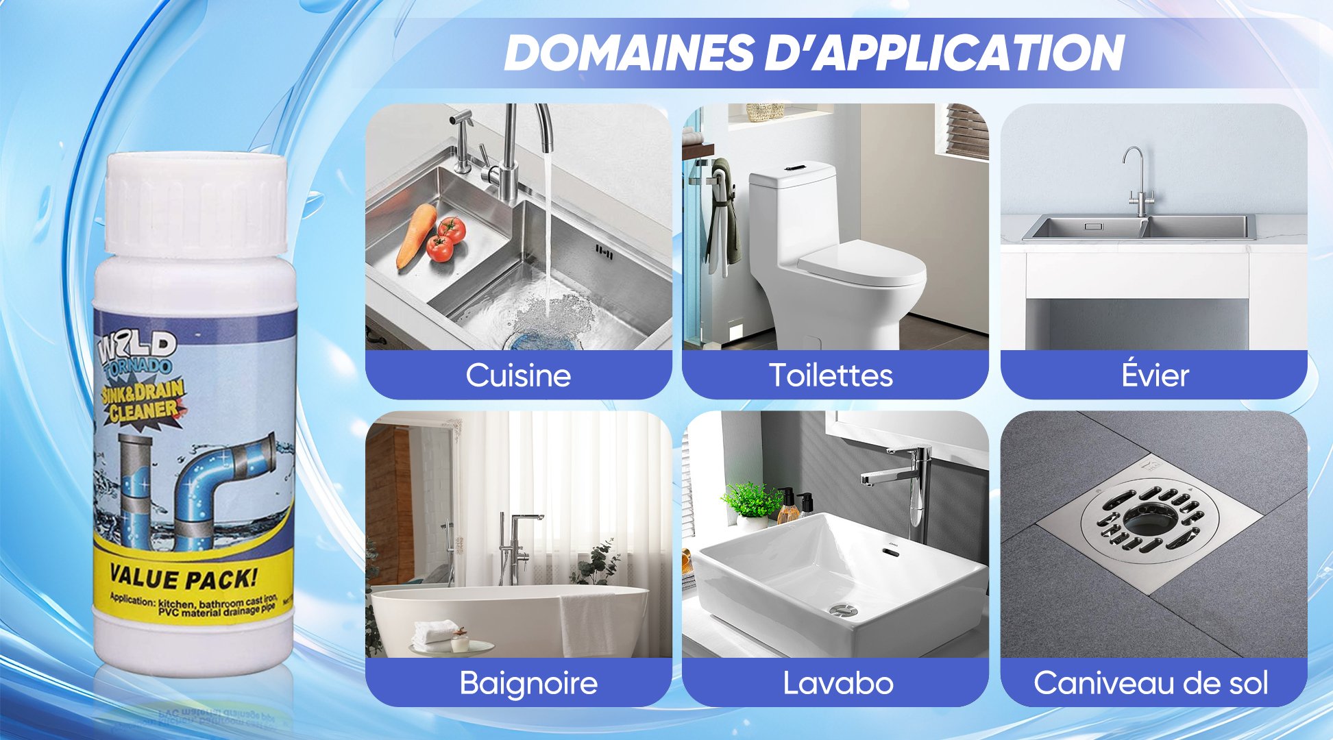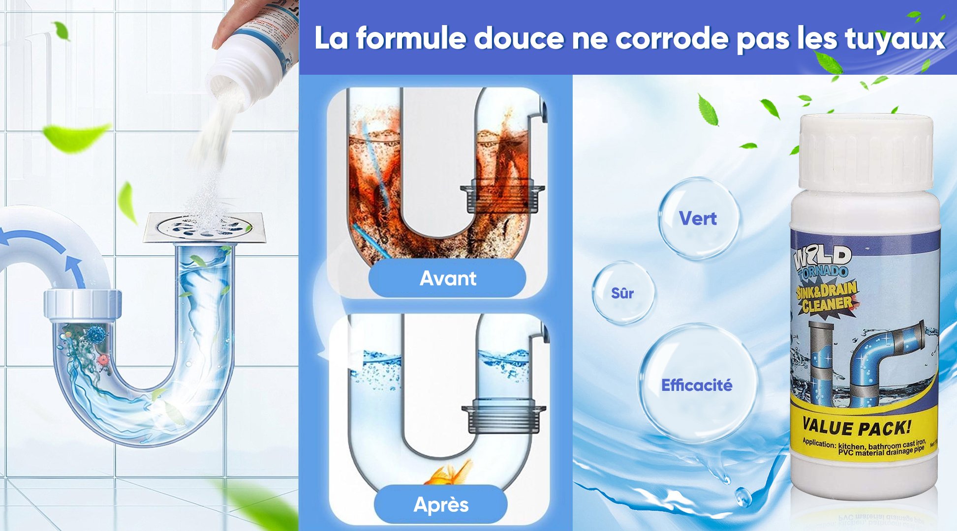 Dissout facilement la graisse, les cheveux, les huiles, la mousse de savon et les produits en papier.