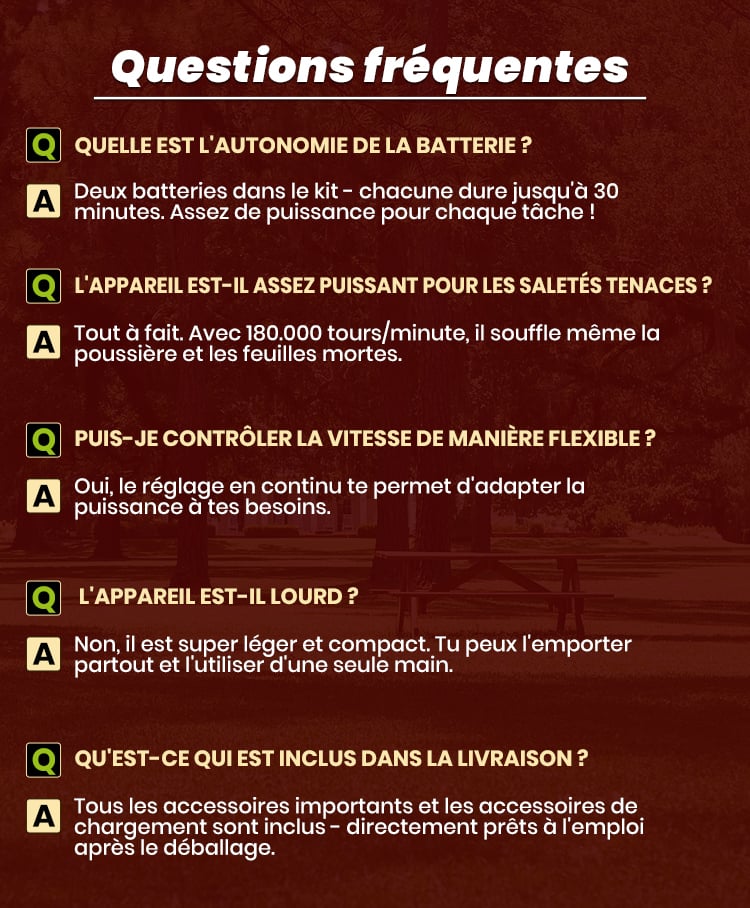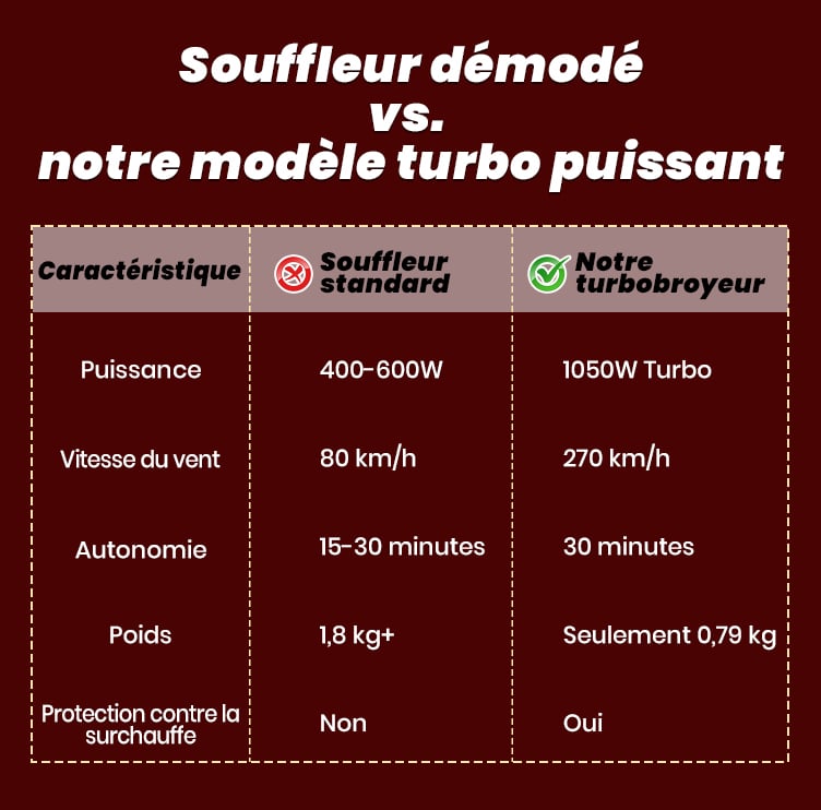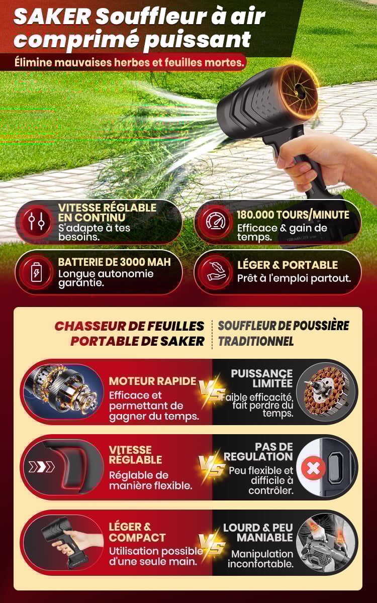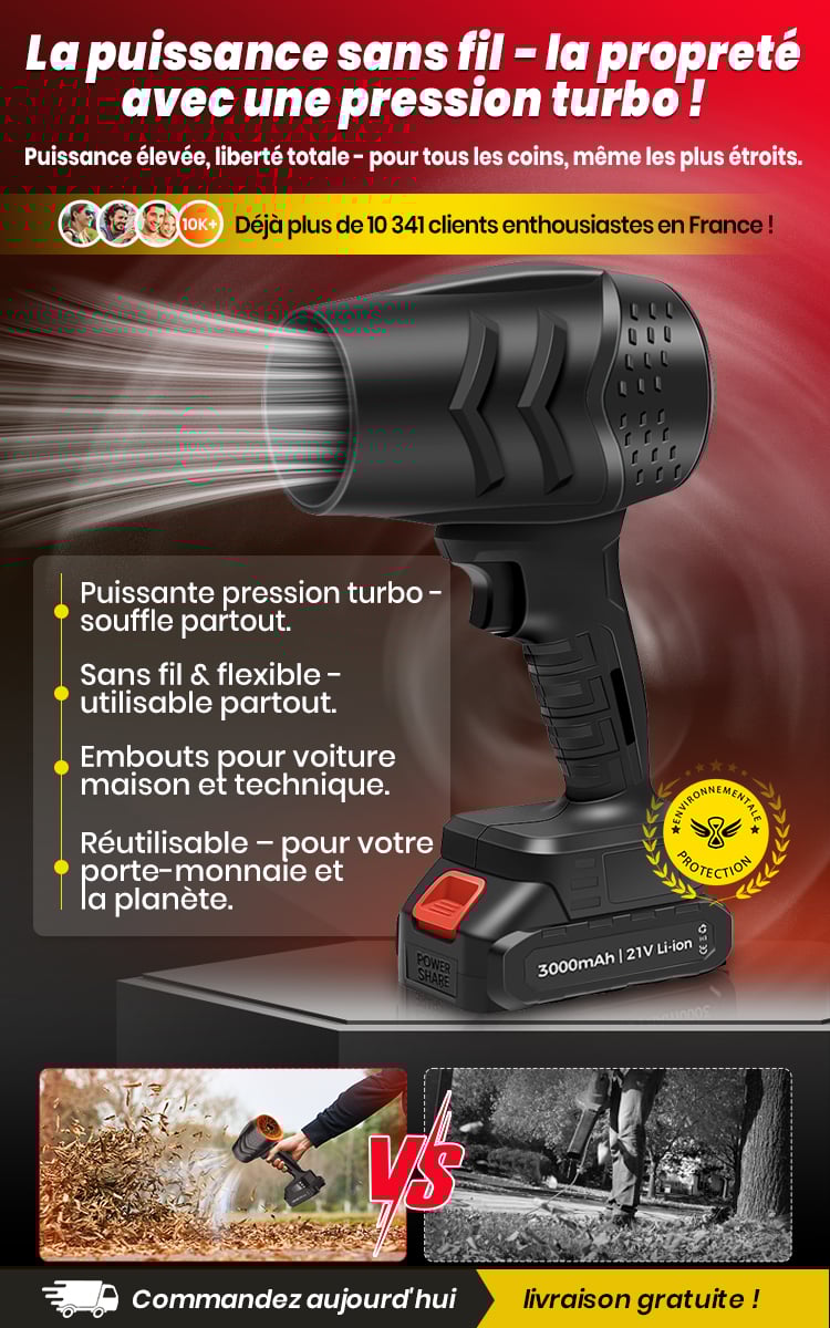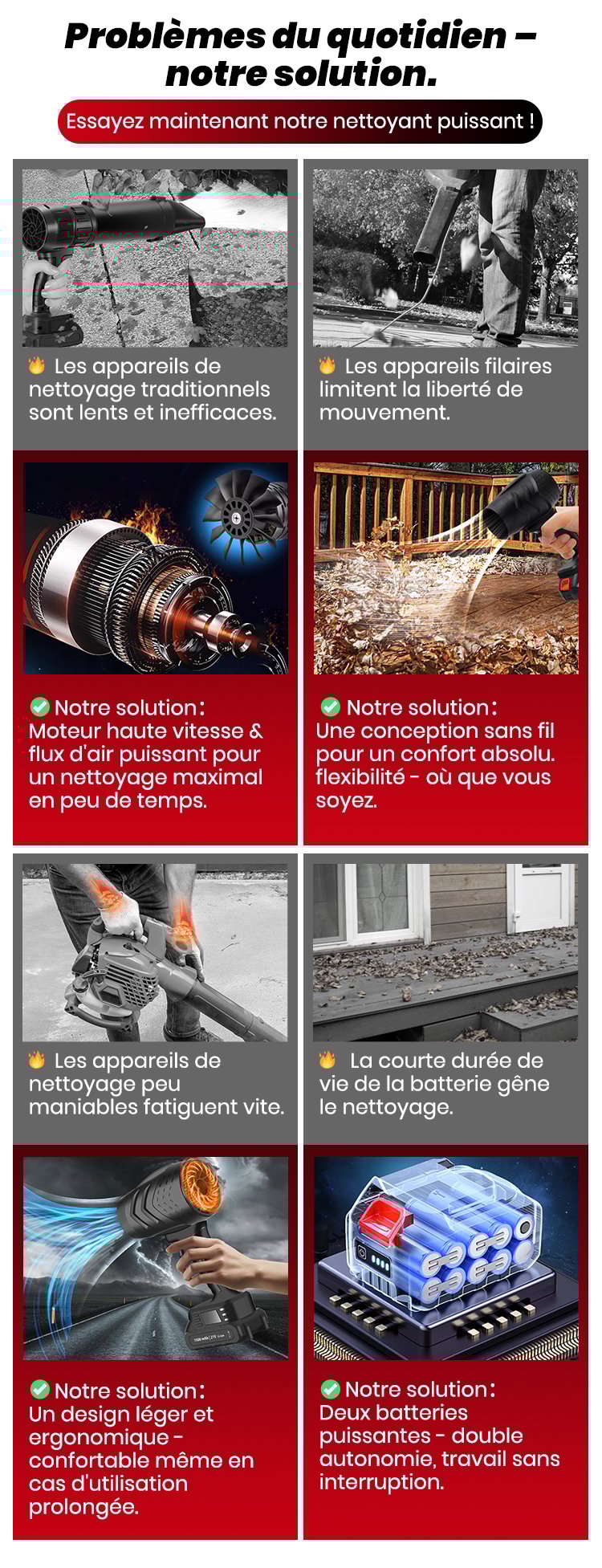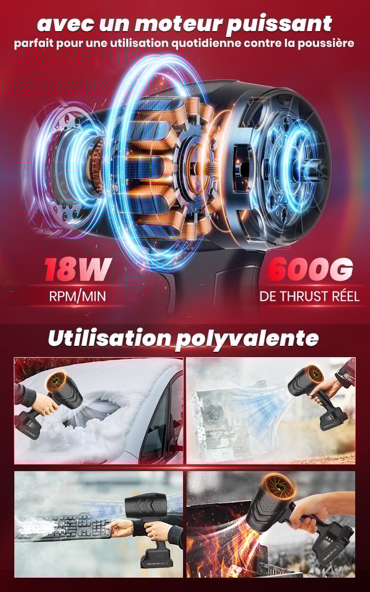 Ce souffleur est étonnamment puissant pour sa taille. Je l'utilise pour nettoyer mon garage, l'intérieur de ma voiture et même les feuilles tombées sur ma terrasse - il fonctionne parfaitement à chaque fois !