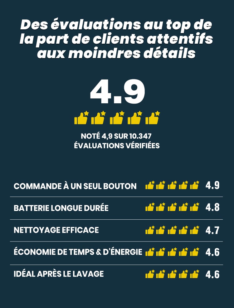 La batterie dure plus longtemps que prévu et se recharge rapidement. C'est mon outil préféré pour la poussière, la saleté et même pour sécher ma voiture après le lavage !
