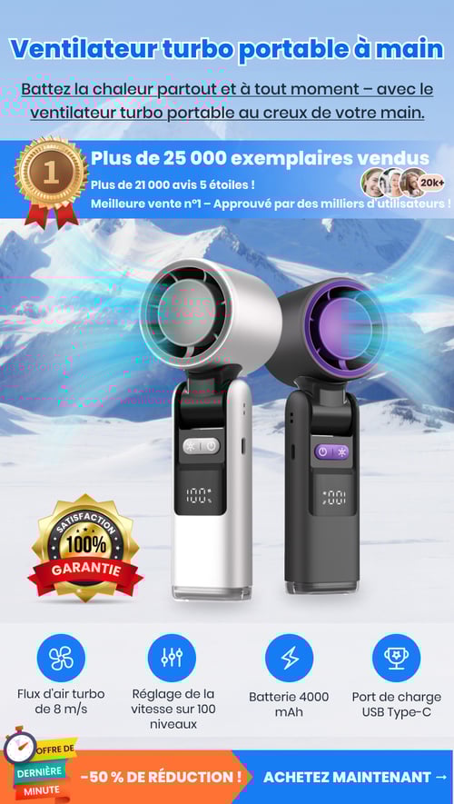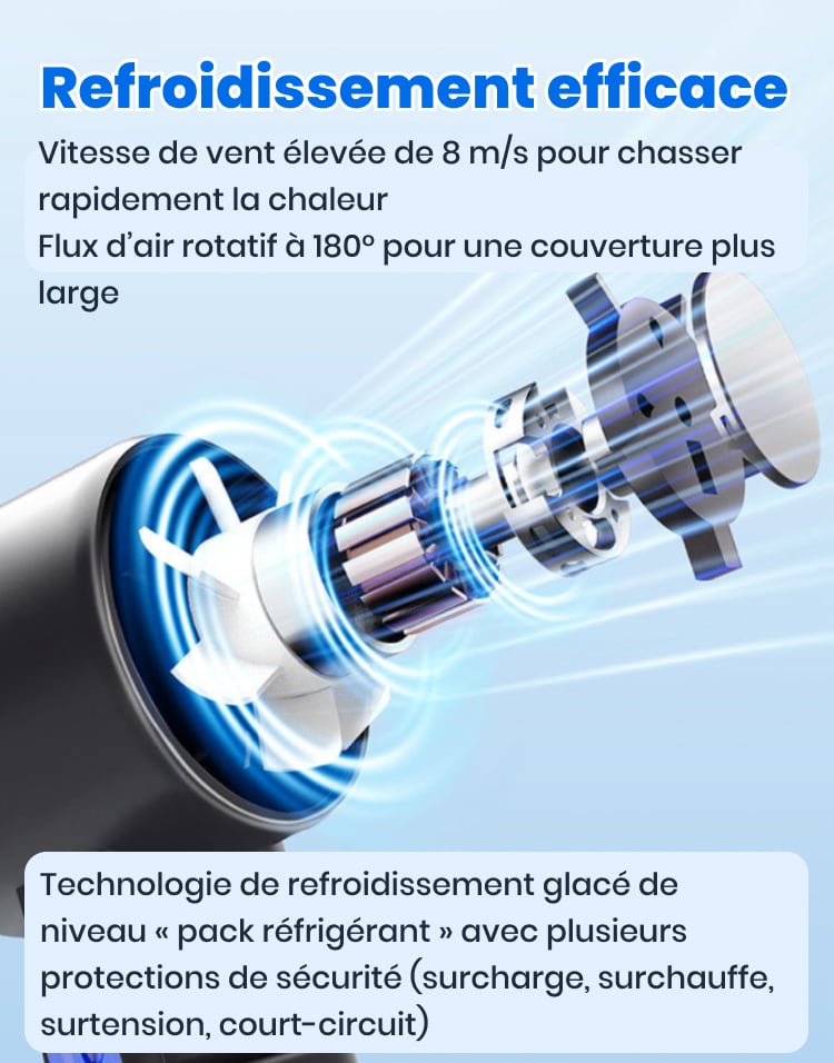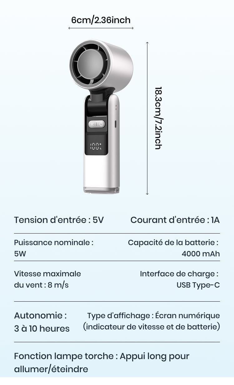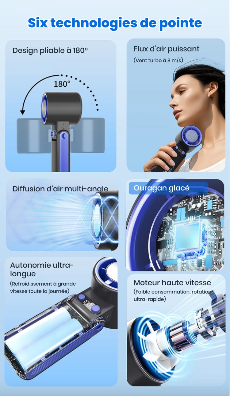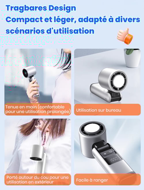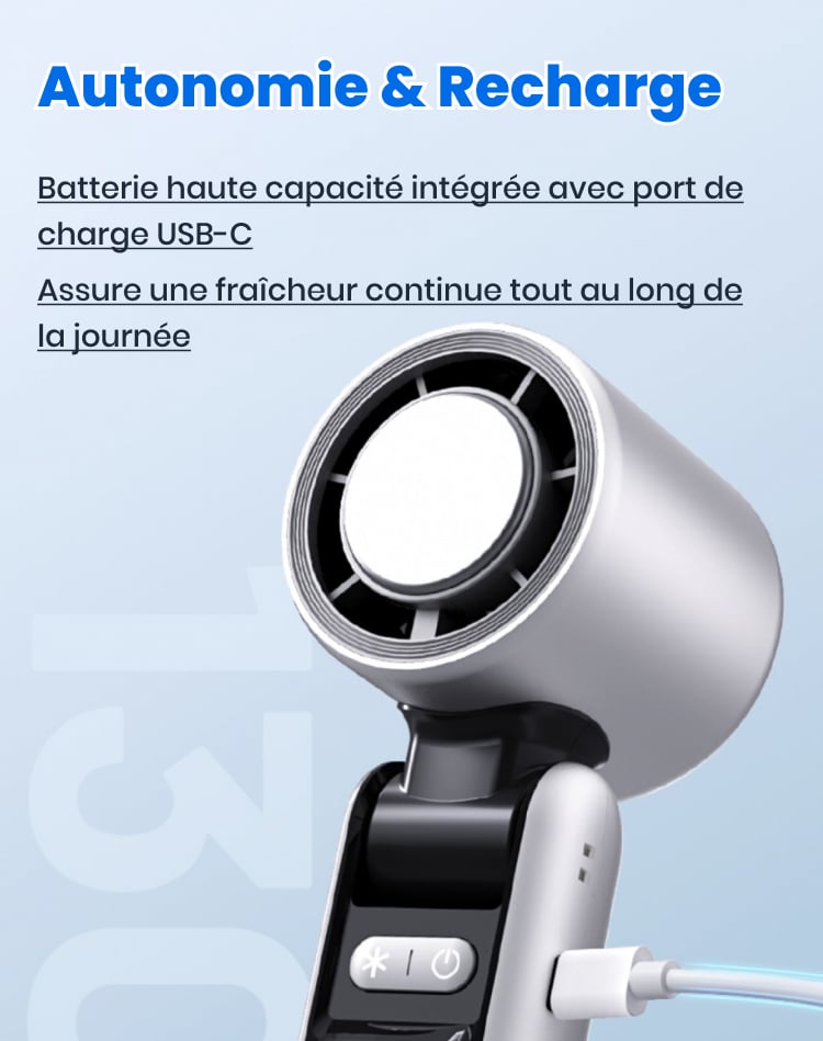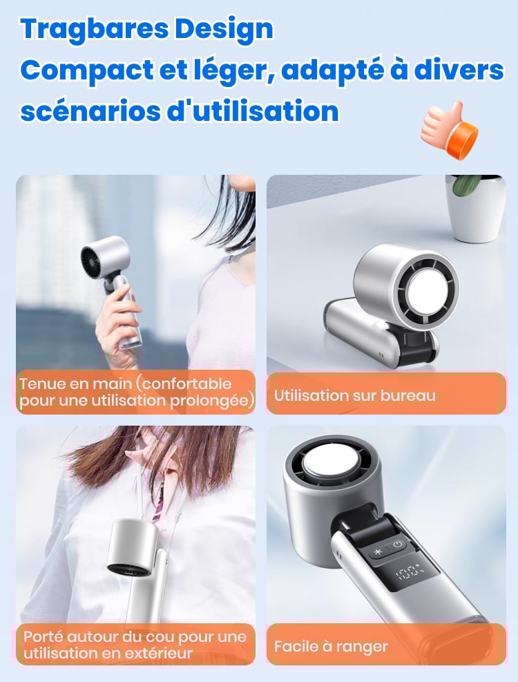 Oui ! Il produit un vent turbo allant jusqu’à 8 m/s, bien plus puissant que les ventilateurs portables classiques — parfait pour les fortes chaleurs, les randonnées ou les trajets quotidiens.