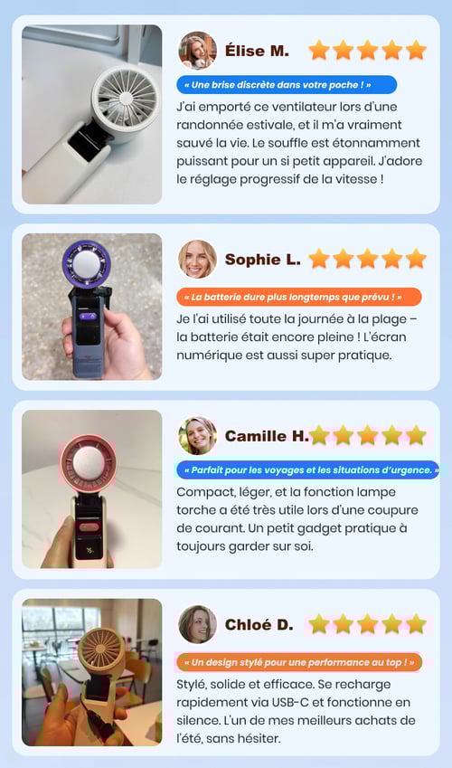Honnêtement, je ne m’attendais pas à ce qu’un si petit ventilateur soit aussi puissant ! Je l’ai emporté en randonnée en montagne et il m’a gardé au frais tout le long — il semble même plus puissant que certains ventilateurs de bureau.